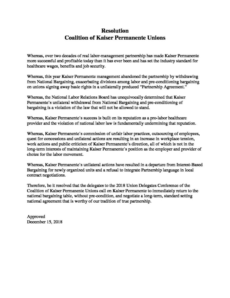 Coalition of Kaiser Permanente Unions’ Resolution on National Bargaining