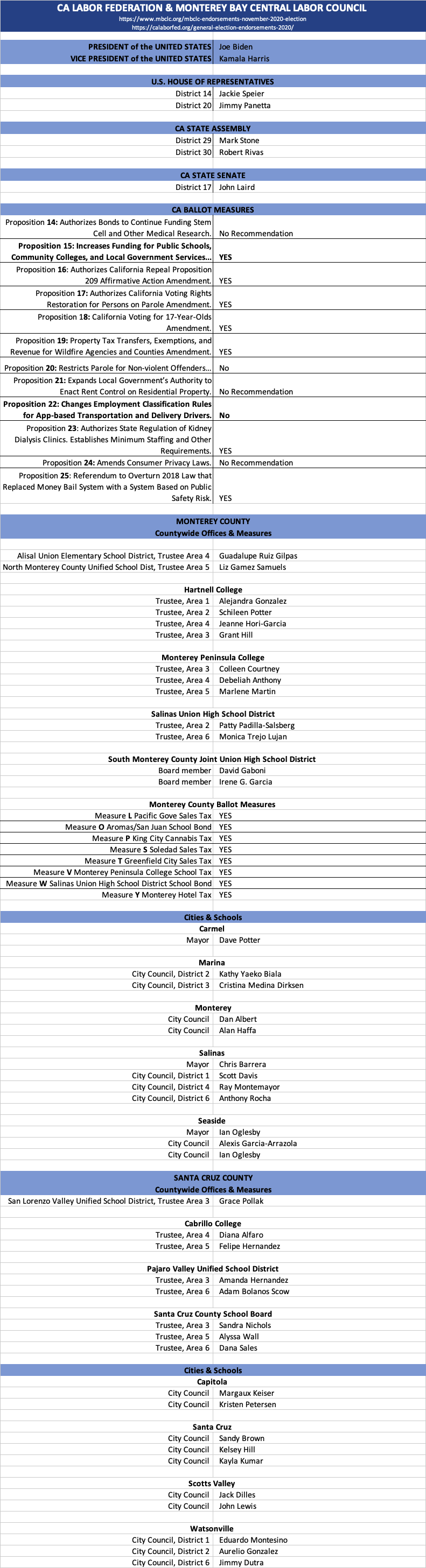 Monterey Labor Council Endorsements