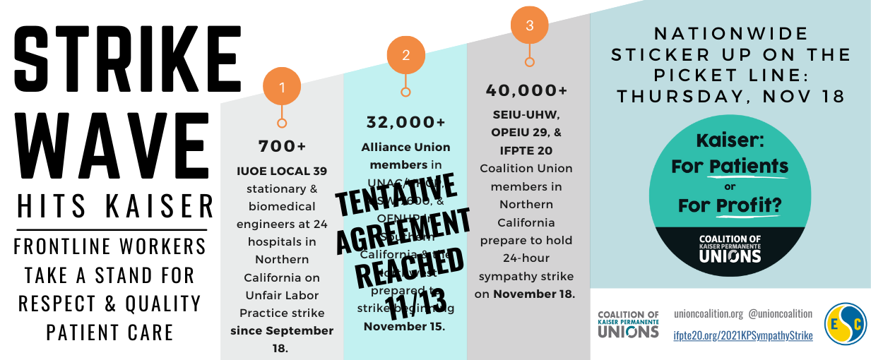 Kaiser, which has raked in billions in profits during the COVID-19 pandemic, still refuses to negotiate in good faith with Local 39’s members. Now going into their 9th week of striking, Local 39 engineers have been without a contract since September 17th. Even a last-ditch effort to bring Kaiser management to the table to avert our sympathy strike showed that Kaiser is truly putting profits first — during 7 hours of negotiations, Kaiser was only in the room for 20 minutes.